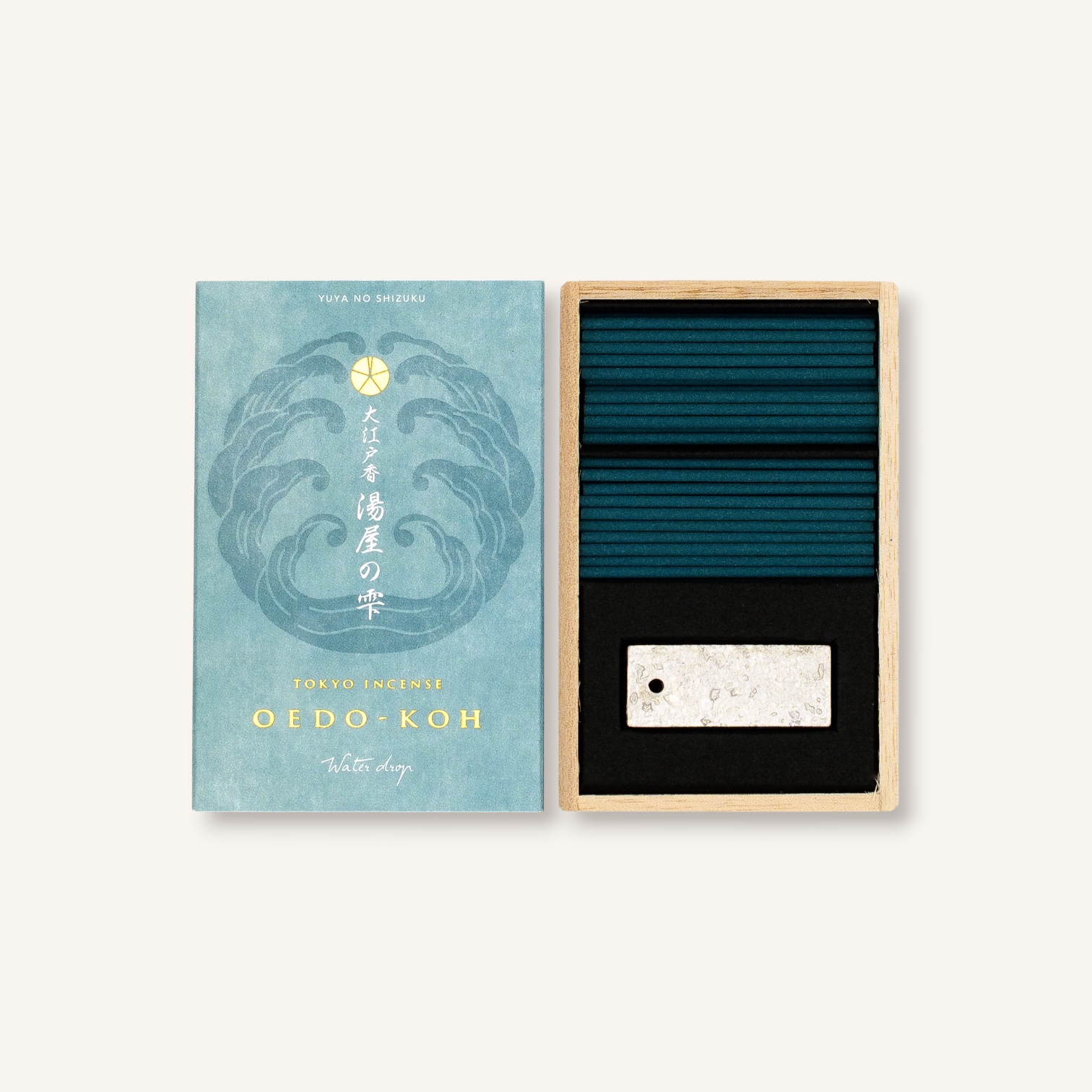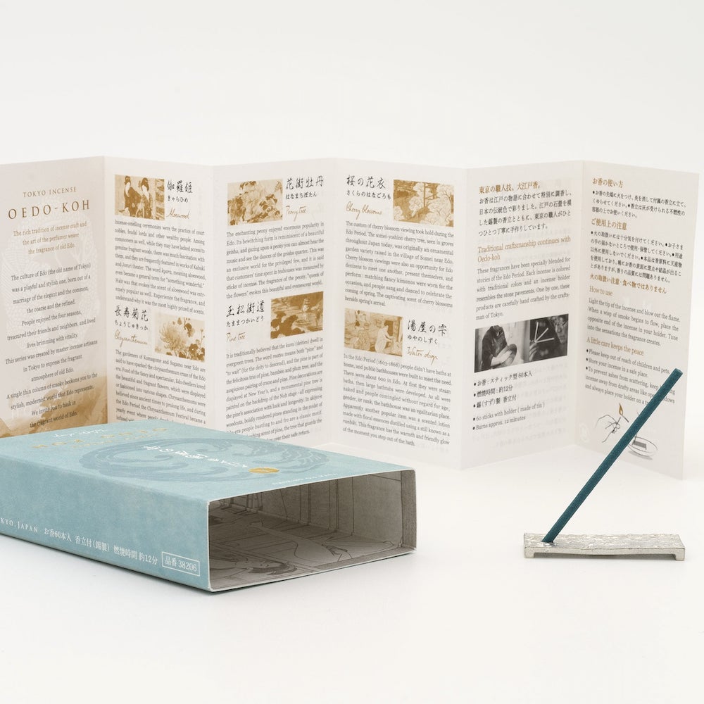 Each package contains 60 incense sticks and a small tin incense holder that resembles the stone pavements of Edo. Tin was a favored metal by the upper class during the Edo period.