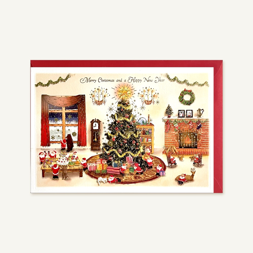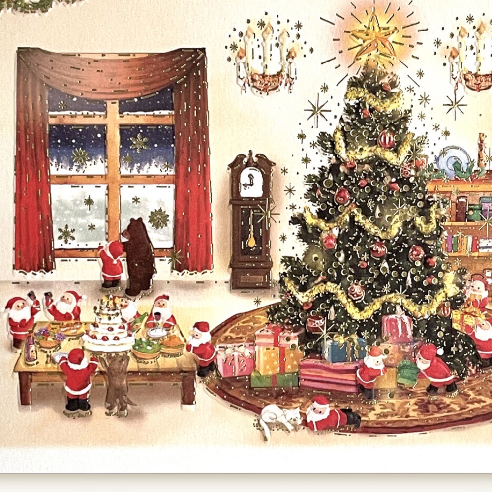 This card shows an enchanting Christmas in a warm, cozy home, where the Mini Santas enjoy the festive atmosphere together with forest animals.