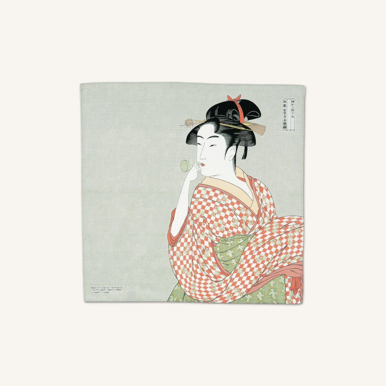 Dieses ikonische Werk von Utamaro zeigt eine junge Frau, die mit einem kleinen Spielzeug aus Gras spielt, indem sie es pustet, um ein „knallendes“ Geräusch zu erzeugen. Ihr leuchtend roter Kimono mit Schachbrettmuster ist beeindruckend und verleiht der Szene eine besondere Eleganz.