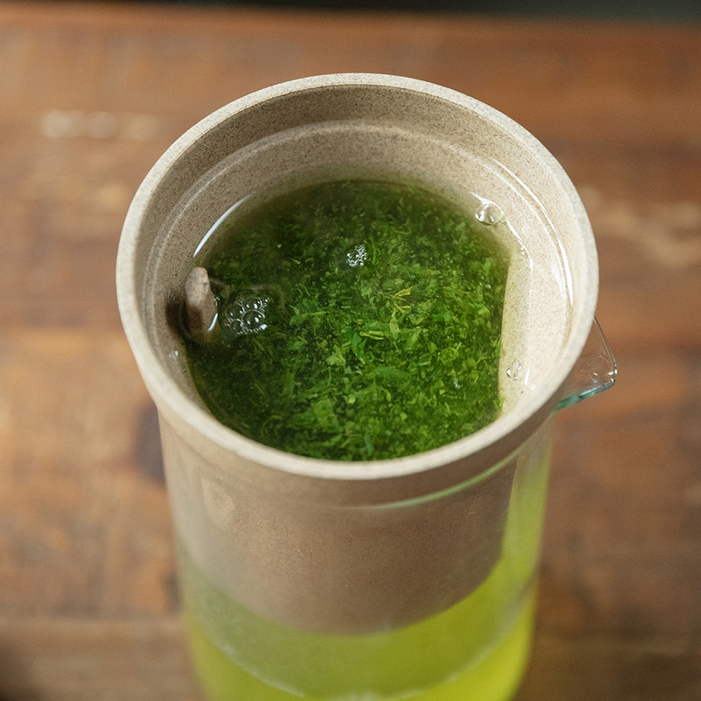 Gefertigt aus glasiertem Halbporzellan und hitzebeständigem Glas, verbindet der Dripper Funktionalität mit einer stillen Ästhetik. Durch das Glas lässt sich beobachten, wie sich Farbe und Aroma entfalten. Ideal für ca. 300 ml Tee und geeignet für warme wie kalte Aufgüsse.