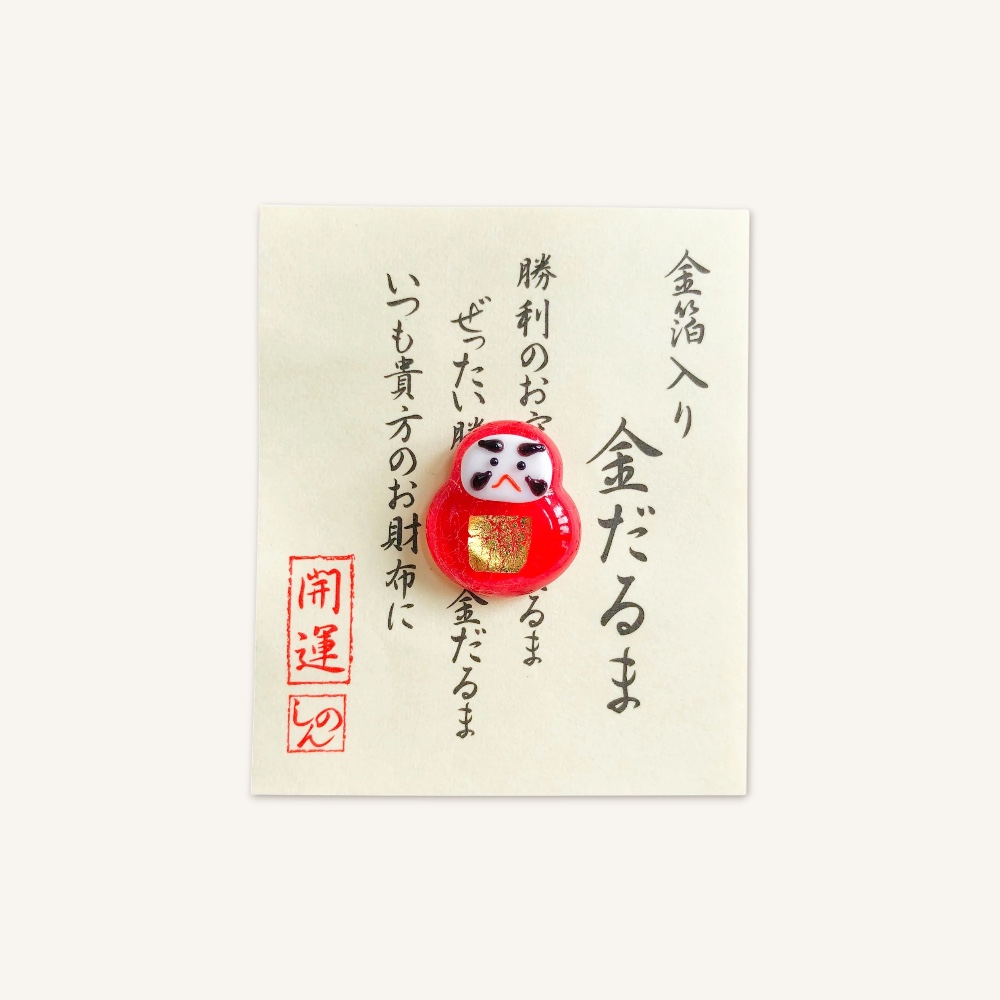 Dieser kleine Darum wird traditionell in der Brieftasche oder im Geldbeutel aufbewahrt, um dein Geld zu schützen. Der Daruma ist ein traditioneller Talisman, der dich daran erinnert, deine Ziele zu verfolgen. Die runde Form steht für Standfestigkeit, und die rote Farbe wird mit Schutz und Erfolg assoziiert. Dieser kleine Glücksbringer ermutigt dich, Herausforderungen zu meistern und deine Wünsche wahr werden zu lassen!