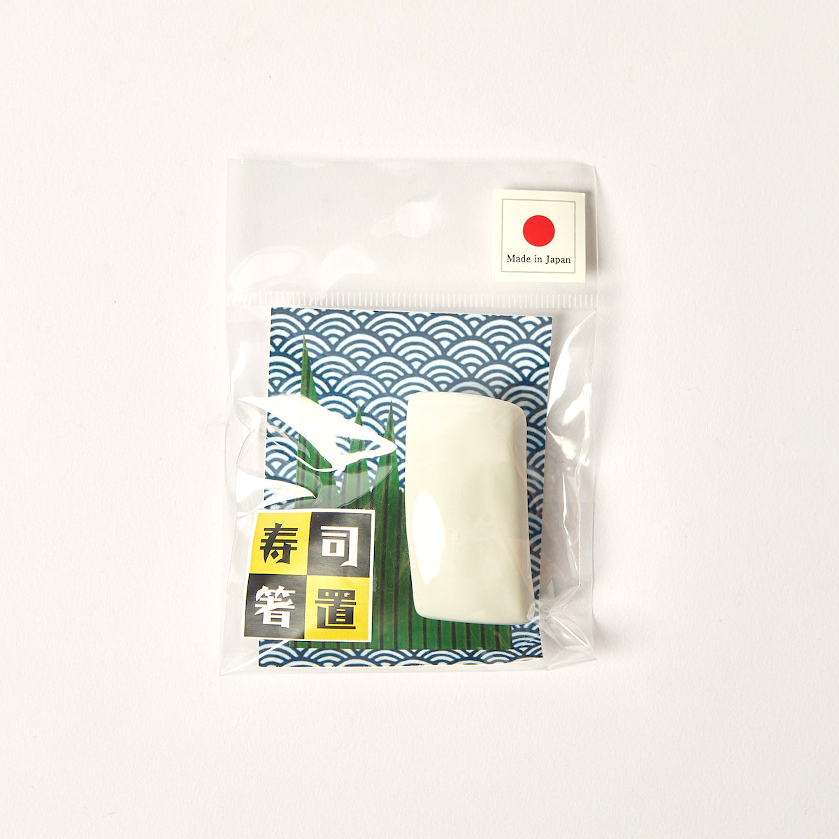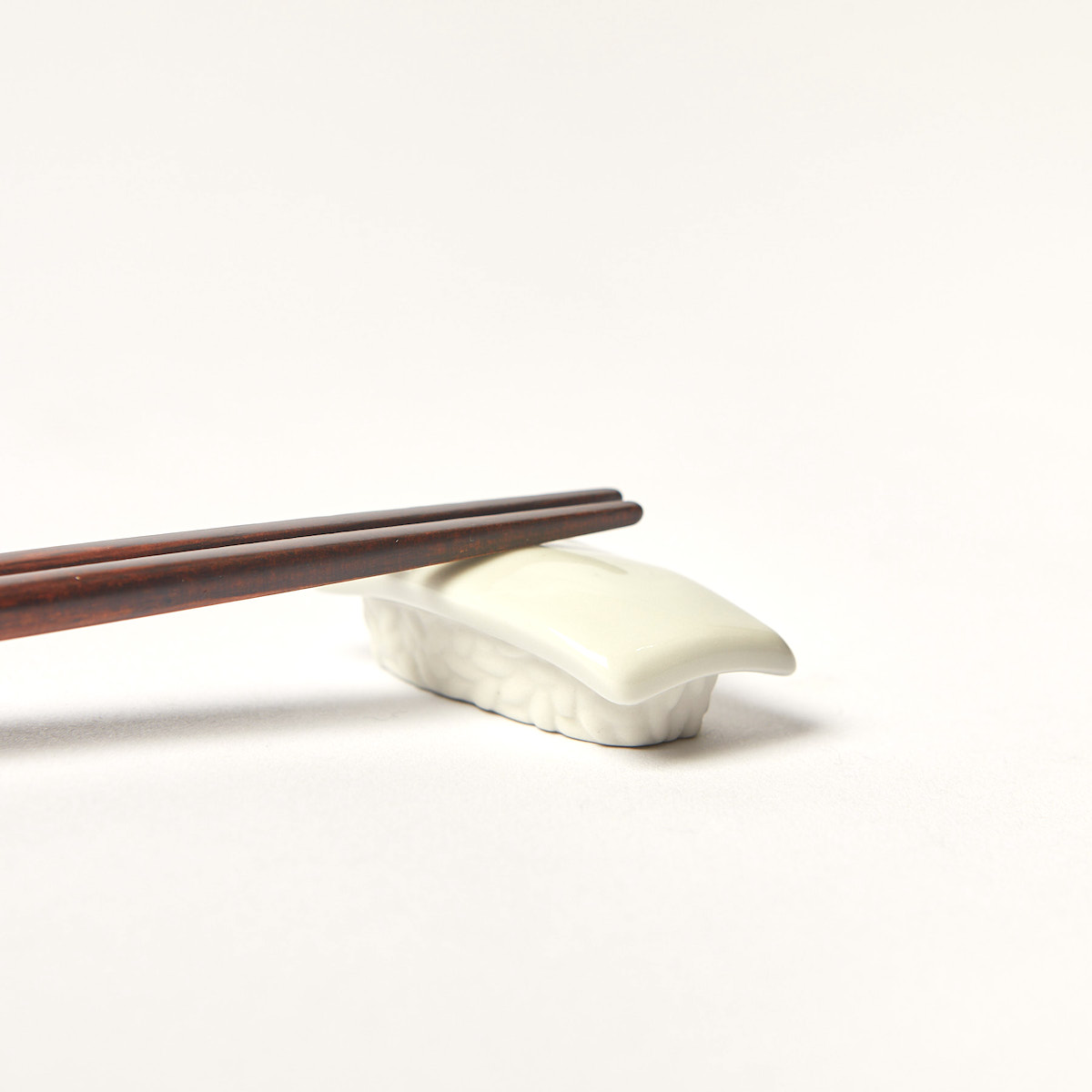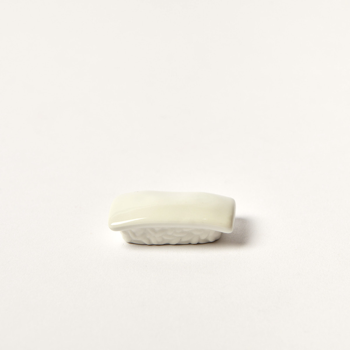 Diese Stäbchenablage aus Keramik hat die Form eines Nigiri-Sushis, das mit einem köstlichen Stück Tintenfisch (Ika) belegt ist.