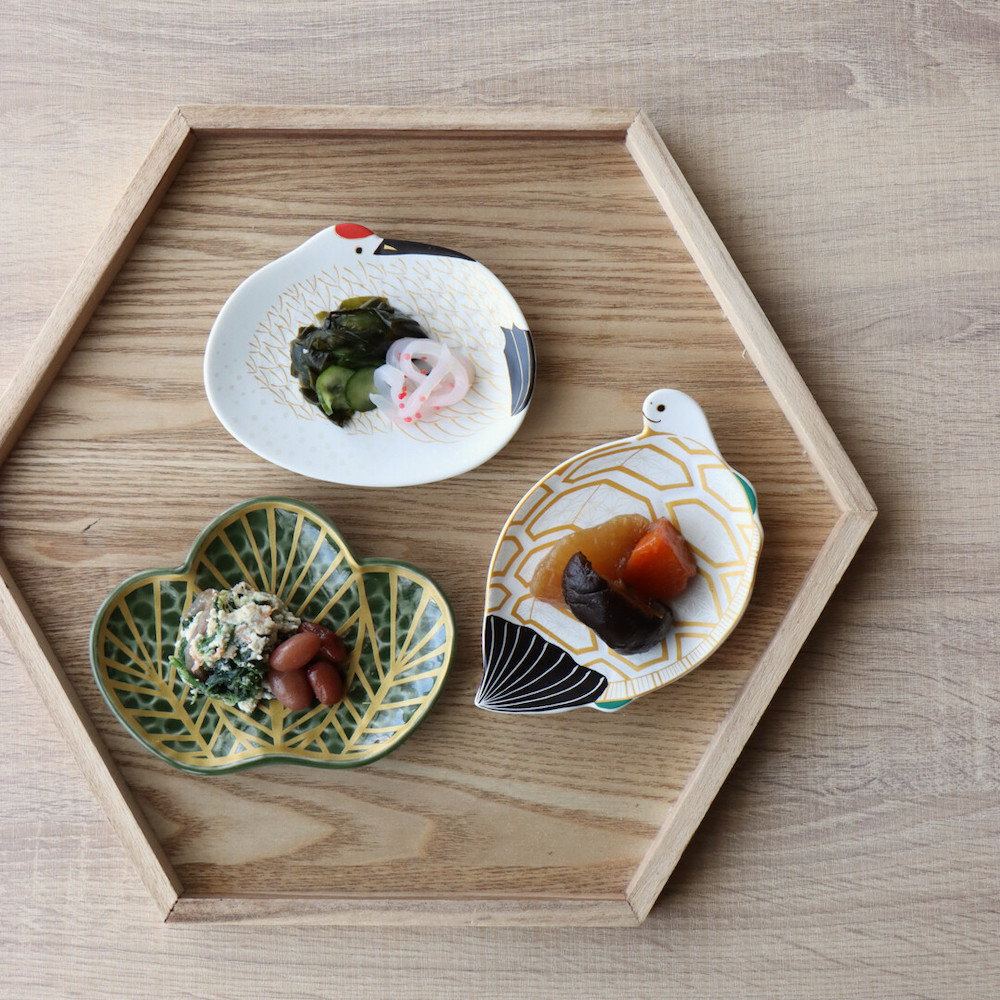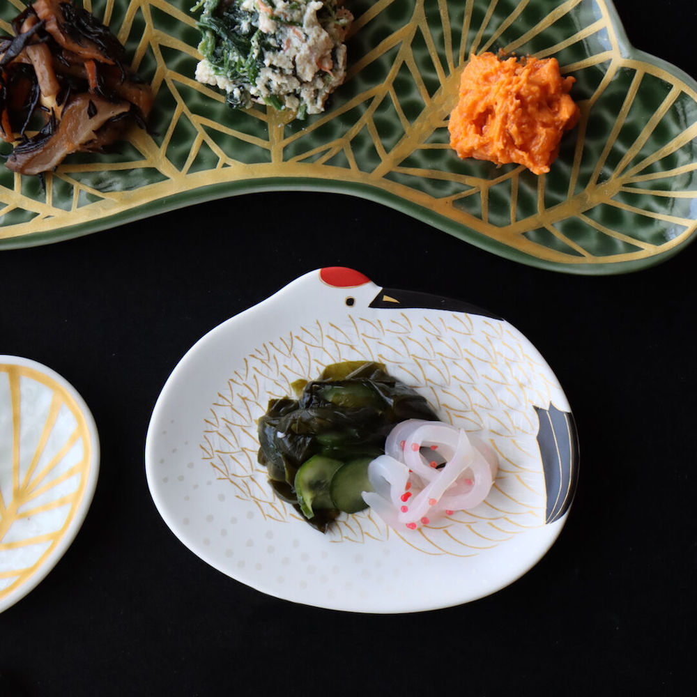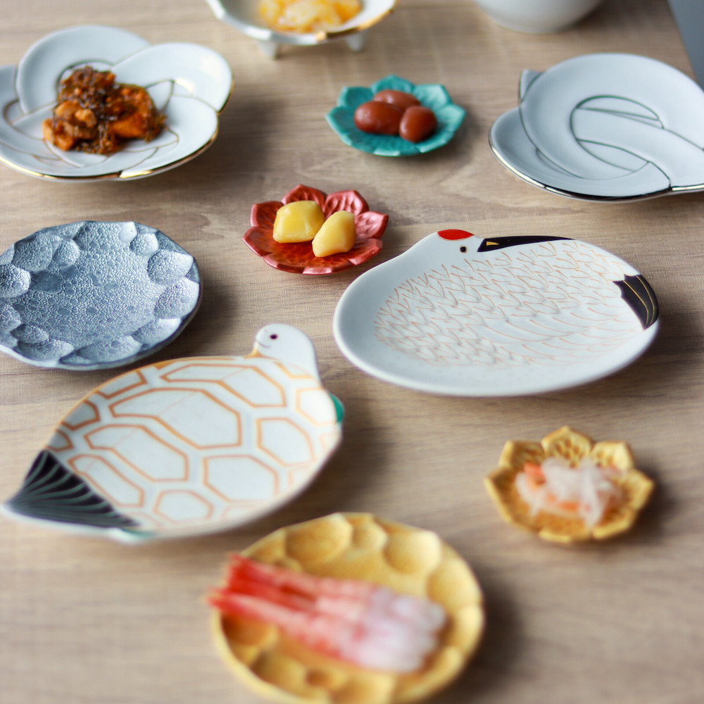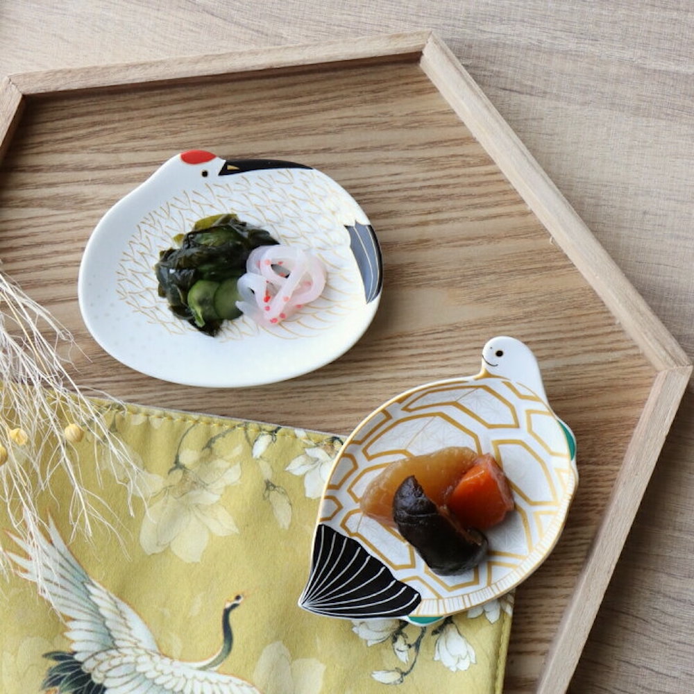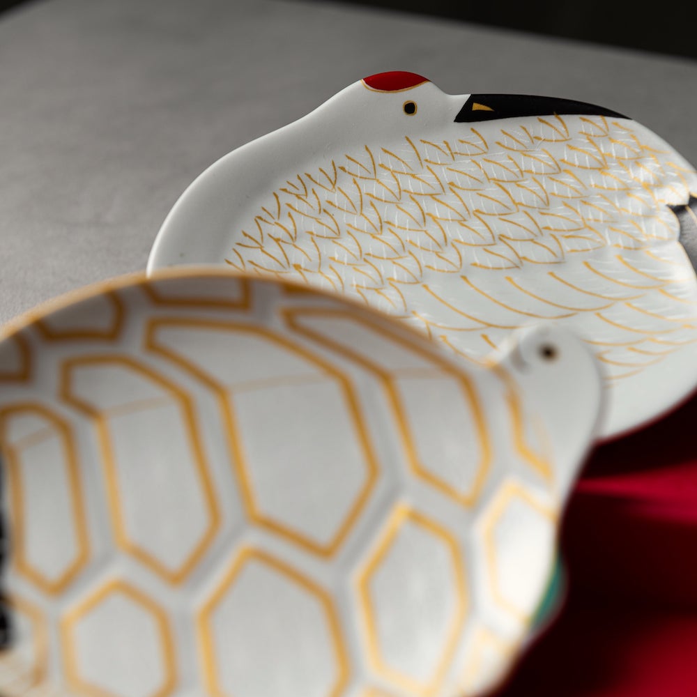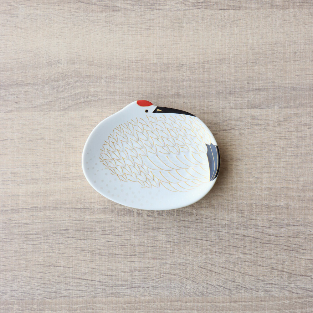 Ein kleiner Teller in Form eines Kranichs, gefertigt in der Traditionsmanufaktur Kouraku Kiln in Arita, dem Ursprungsort des Aritayaki-Porzellans.