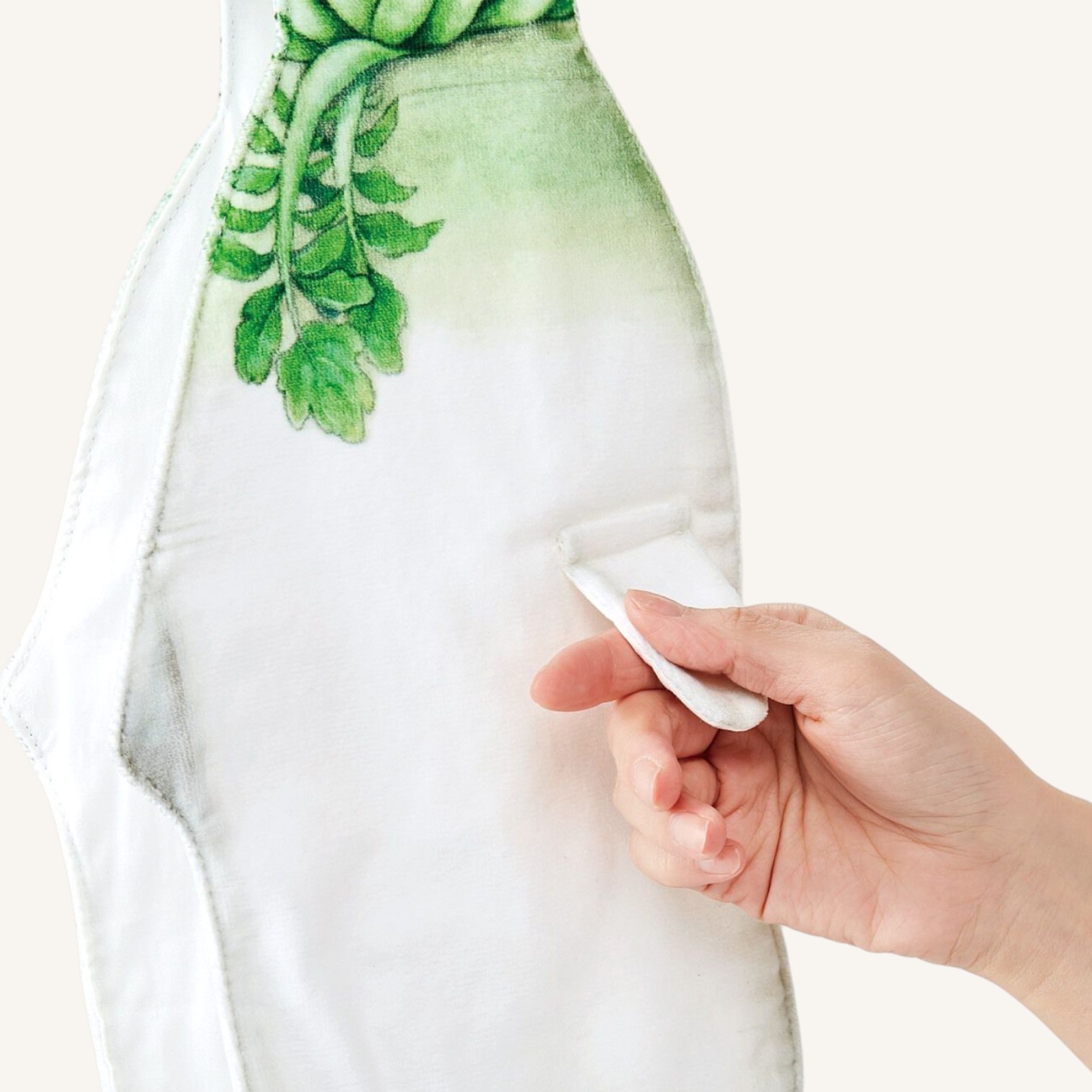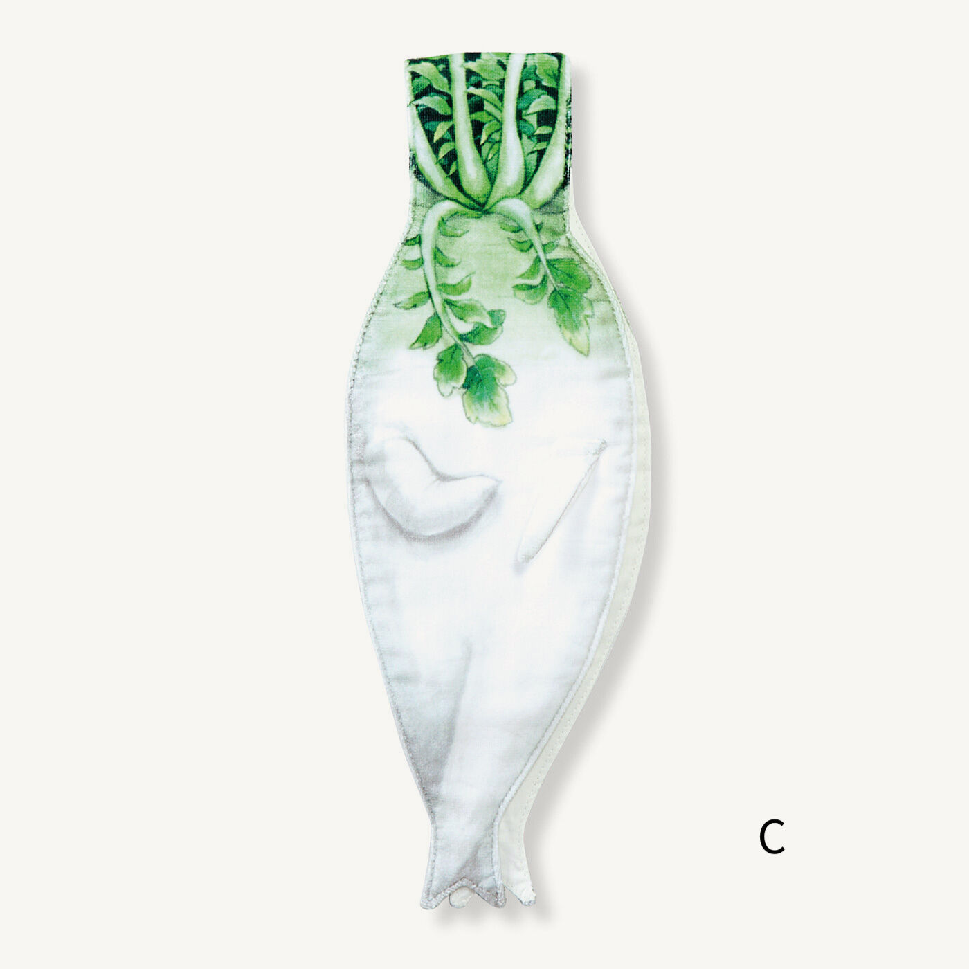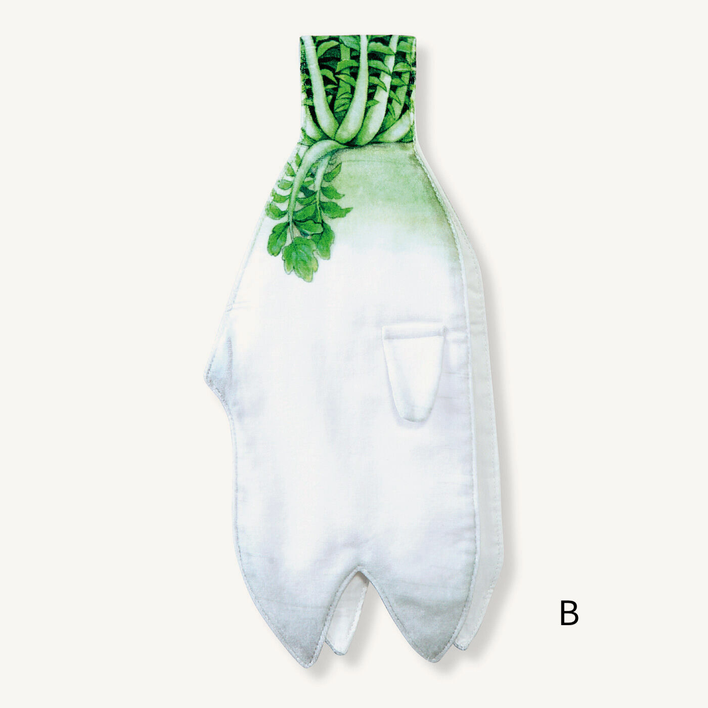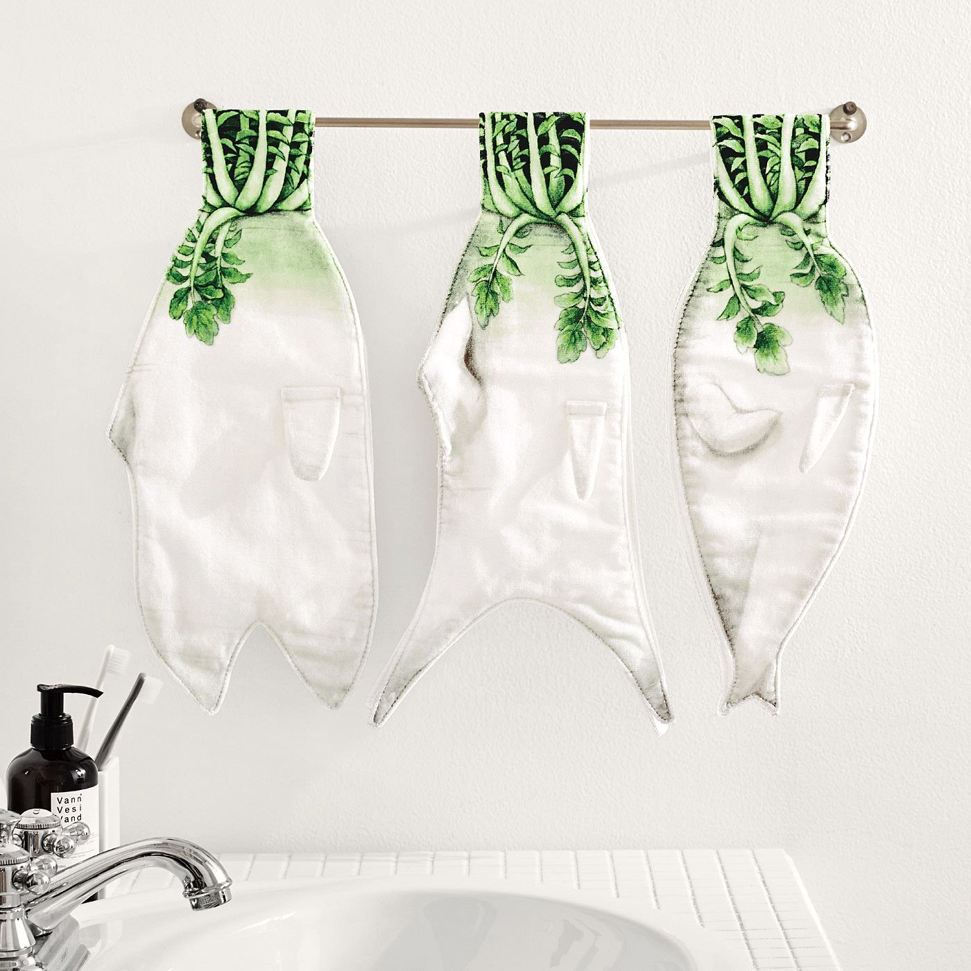 Dieses Handtuch ist von den vielfältigen Wachstumsformen des Rettichs inspiriert und erinnert an das traditionelle Trocknen von Daikon vor der Herstellung von Takuan (eingelegter Rettich). Mit seinem separat angebrachten linken Arm lädt es dazu ein, ihm die Hand zu schütteln, während du dir die Hände abtrocknest.