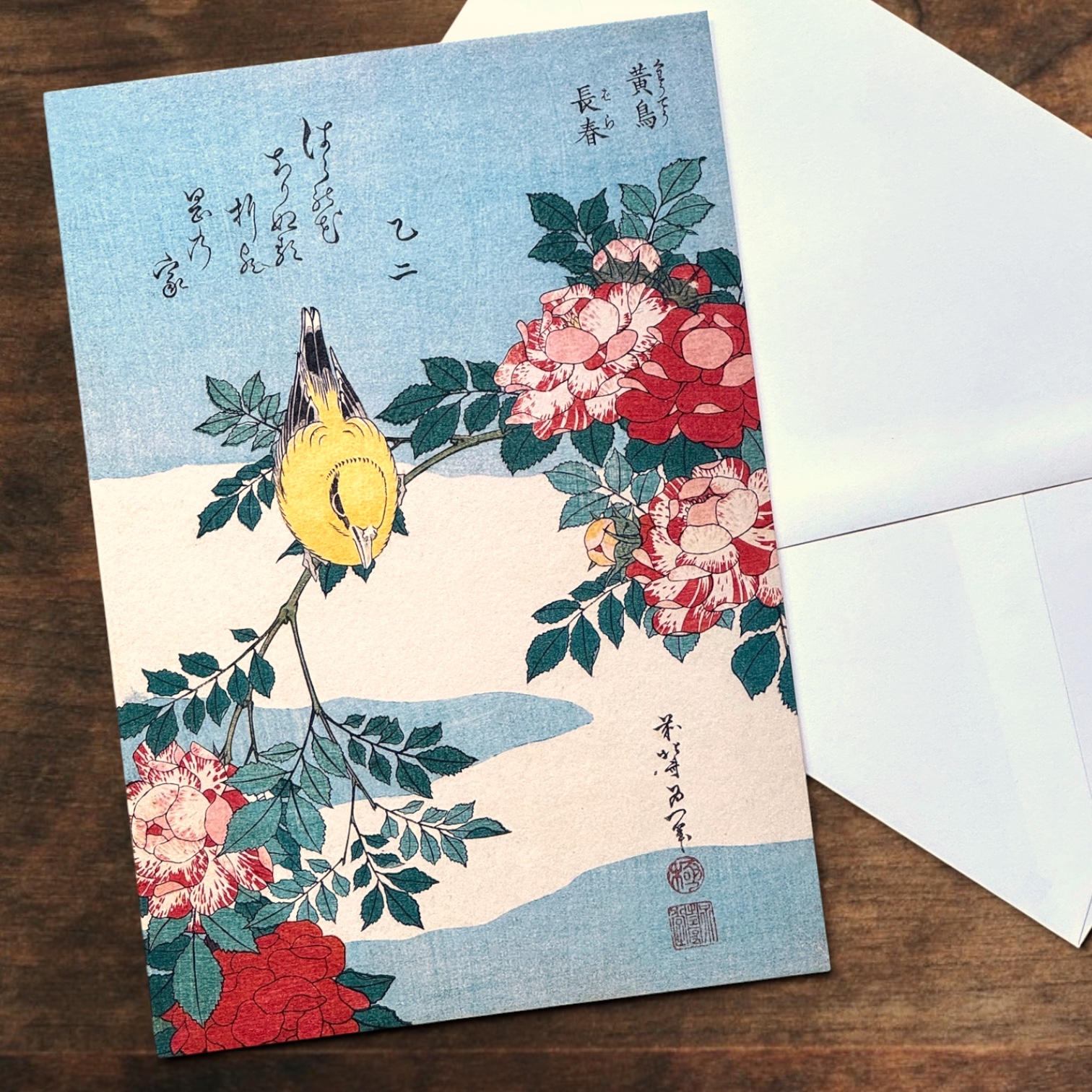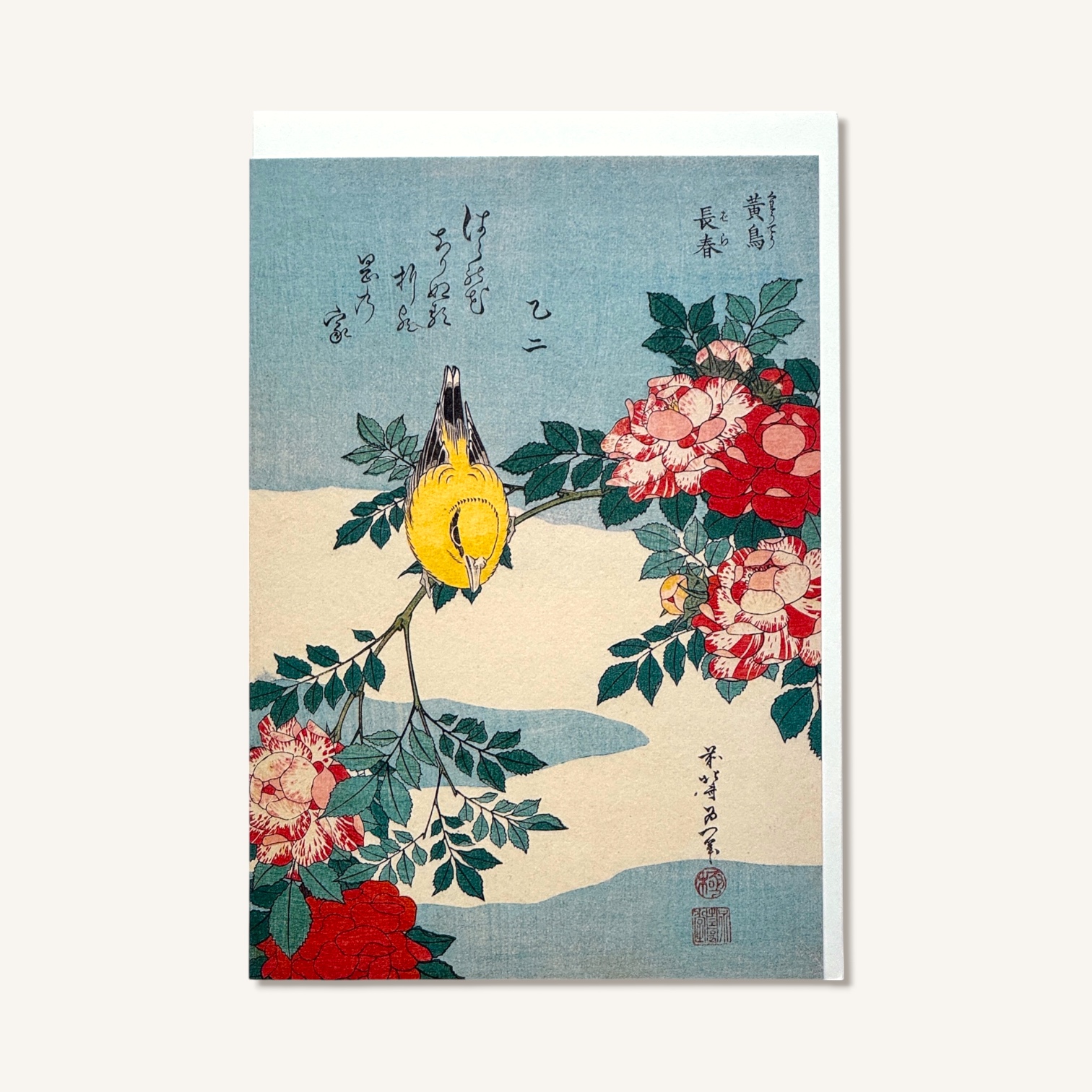 Diese Faltkarte mit Umschlag präsentiert das berührende Werk „Japanische Nachtigall und Rosenzweig (1832)“ von Hokusai. Die zarten Farben und die ruhige Szene verleihen der Karte eine besondere Stimmung, die sie zu einem idealen Geschenk für jeden Anlass macht.