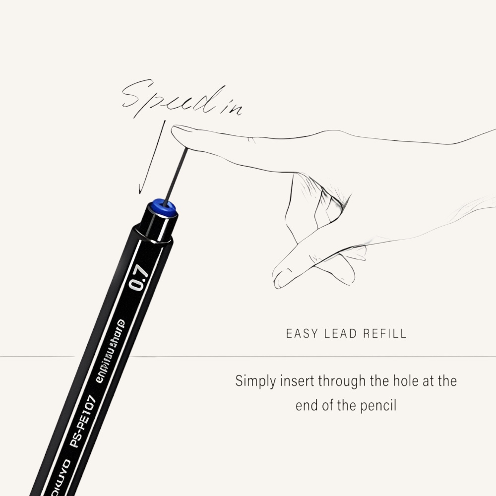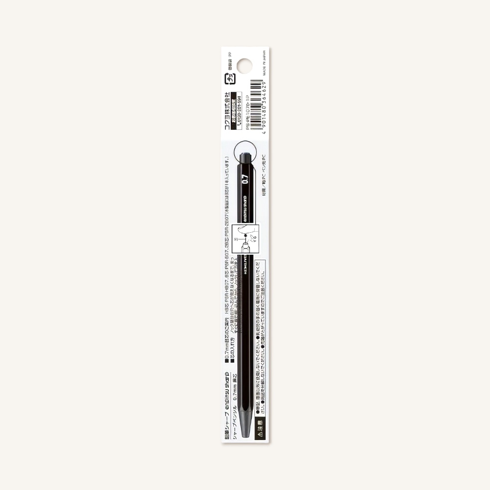Dieser Druckbleistift zeichnet sich durch sein schlankes, sechseckiges Design aus, das an einen traditionellen Bleistift erinnert. Die glänzende Oberfläche und die angespitzte Textur der Stiftspitze unterstreichen dieses Design. Mit einer feinen 0,7-mm-Mine eignet er sich besonders für weiches Schreiben und Zeichnen.