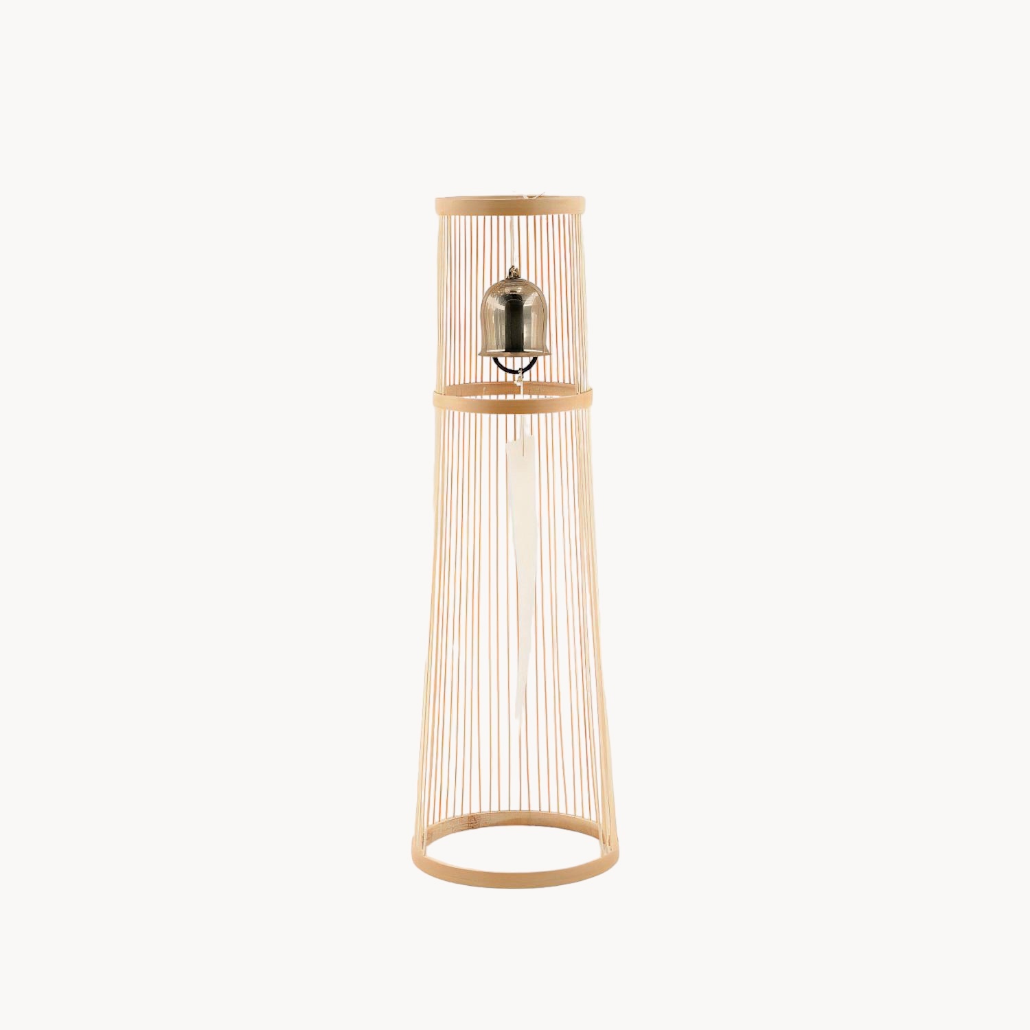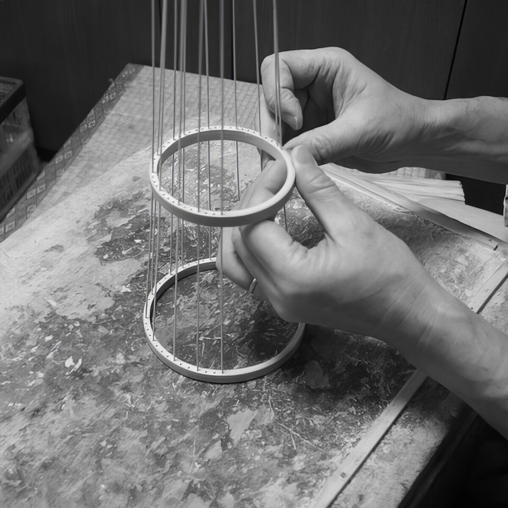 Der Ständer besteht aus Suruga Sensuji-Bambus. Dabei wird Bambus in 41 feine, abgerundete Stäbe geschnitten, einzeln eingesetzt und verklebt. So entsteht eine filigrane und zugleich stabile Konstruktion. Mit der Zeit verändern sich Farbe und Glanz des Bambus und entwickeln eine warme, vertraute Patina.