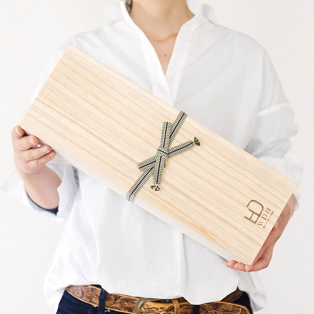 Beide Windspiele werden in einer Paulownia-Holzbox mit Sanada-Schnur geliefert. Die Sanada-Schnur ist eine robuste, traditionelle Baumwollkordel, die in Japan seit Jahrhunderten für wertvolle Gegenstände wie Schwerter, Kimonos oder Tee-Utensilien verwendet wird. Die Paulownia-Holzbox ist leicht, widerstandsfähig gegen Feuchtigkeit, Feuer und Insekten und eignet sich perfekt zur langfristigen Aufbewahrung.