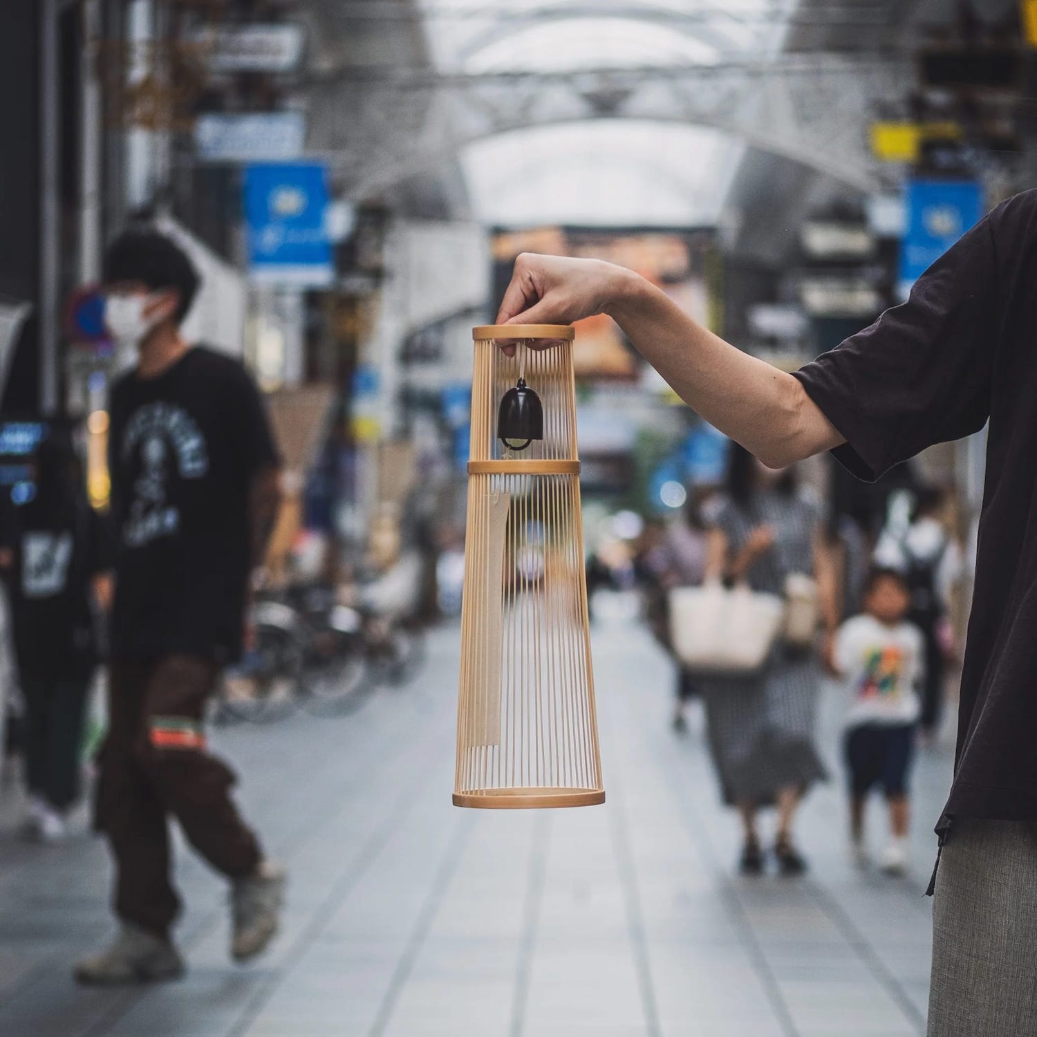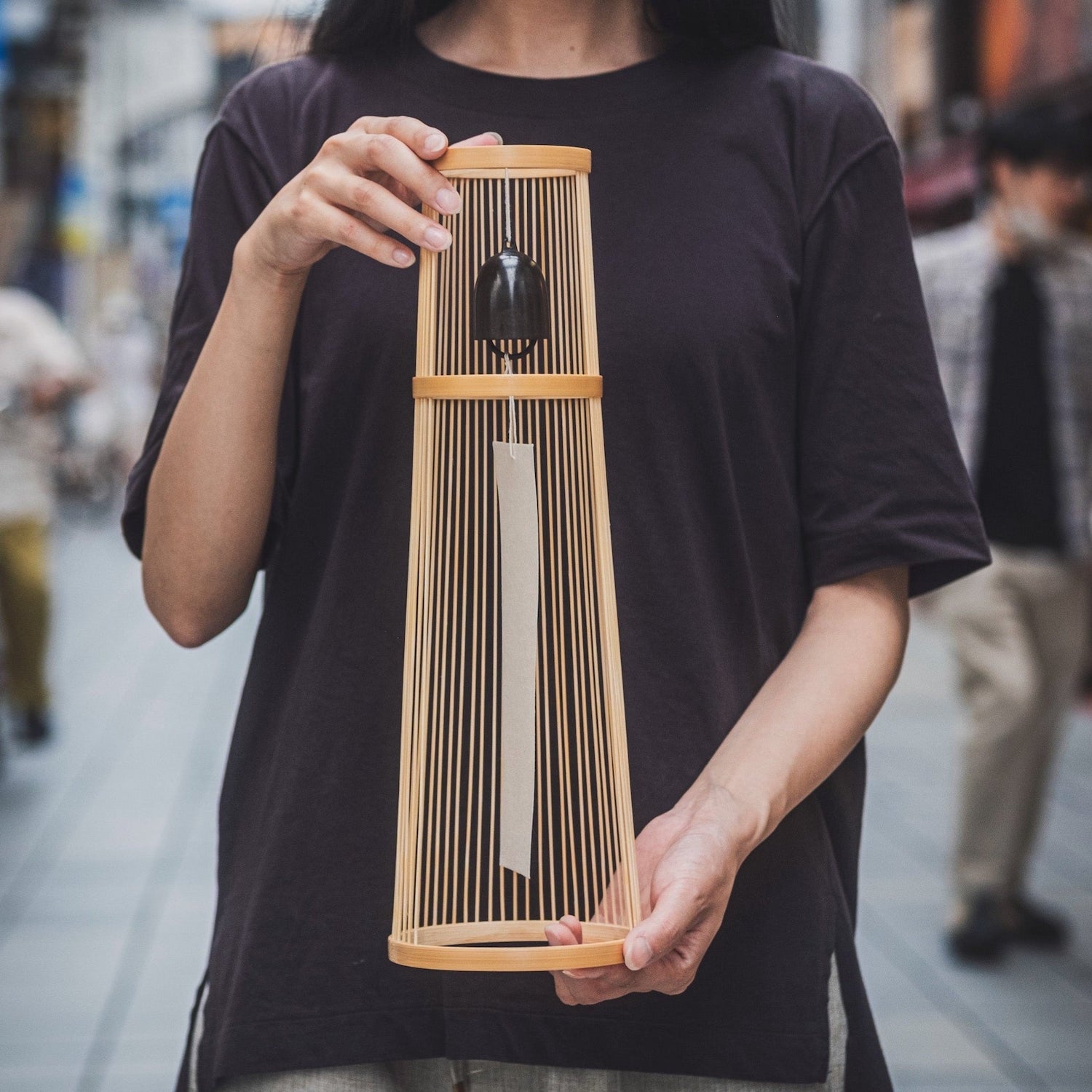 Die Glocken der Windspiele werden in Odawara (Präfektur Kanagawa) gefertigt, einem traditionsreichen Zentrum der Metallgusskunst mit über 800 Jahren Geschichte. Der Bambusständer stammt aus Shizuoka. Für jede Windglocke schmelzen erfahrene Handwerker eine eigens abgestimmte Messinglegierung bei hoher Temperatur. Die Glocken werden einzeln gegossen, sorgfältig poliert und klanglich geprüft – mit viel Zeit, Präzision und Hingabe. Der Ständer besteht aus Suruga Sensuji-Bambus. Dabei wird Bambus in 41 feine, abgerundete Stäbe geschnitten, einzeln eingesetzt und verklebt. So entsteht eine filigrane und zugleich stabile Konstruktion. Mit der Zeit verändern sich Farbe und Glanz des Bambus und entwickeln eine warme, vertraute Patina.